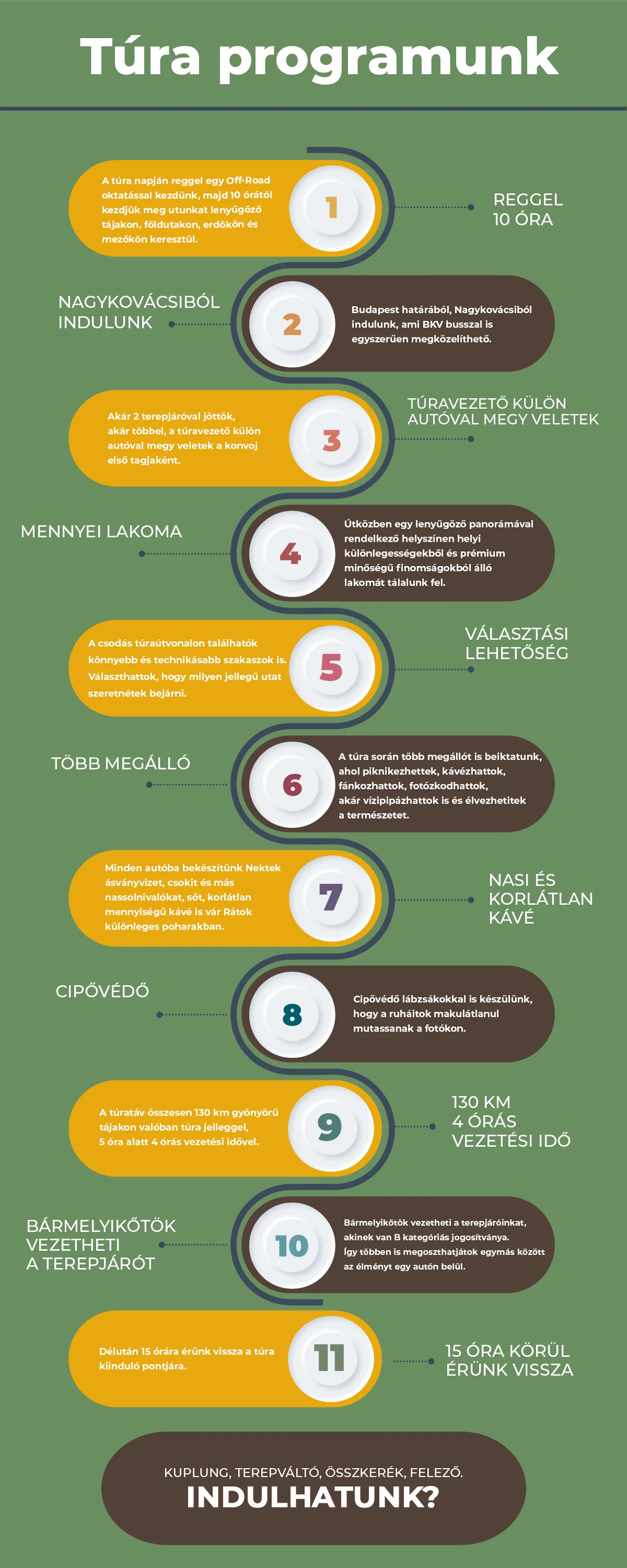 Túránk során felfedezhetitek Magyarország egyik legszebb vidékét, miközben egy Japán Samurai terepjáró kormánya mögött ültök. A reggel 10 és délután 15 óra között zajló túránk során összesen 130km-t megyünk, melynek 70%-át terepen off-road körülmények között. Az út során több pihenőt is tartunk, hogy élvezhessétek a természetet és befogadhassátok a különleges látványt. Az útvonalakat úgy állítottuk össze, hogy tiltott természetvédelmi területet ne érintsünk, a természetet az állatokat és mások munkáját tiszteletben tartsuk, ne zavarjuk, de mégis gyönyörű helyekre kalauzoljunk Titeket.